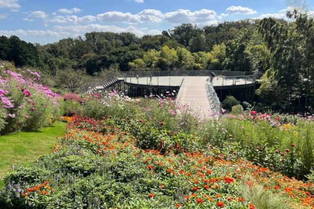 公園内には「メタセコイアの森」と呼ばれるエリアもあります。空に向かってすっと伸びる高い木々がつくる木陰が心地よく、テーブル付きのベンチでひと休みするのもおすすめです。ここにいると、まるで北欧の森に迷い込んだような気分で、時間を忘れてゆったりと過ごせます。